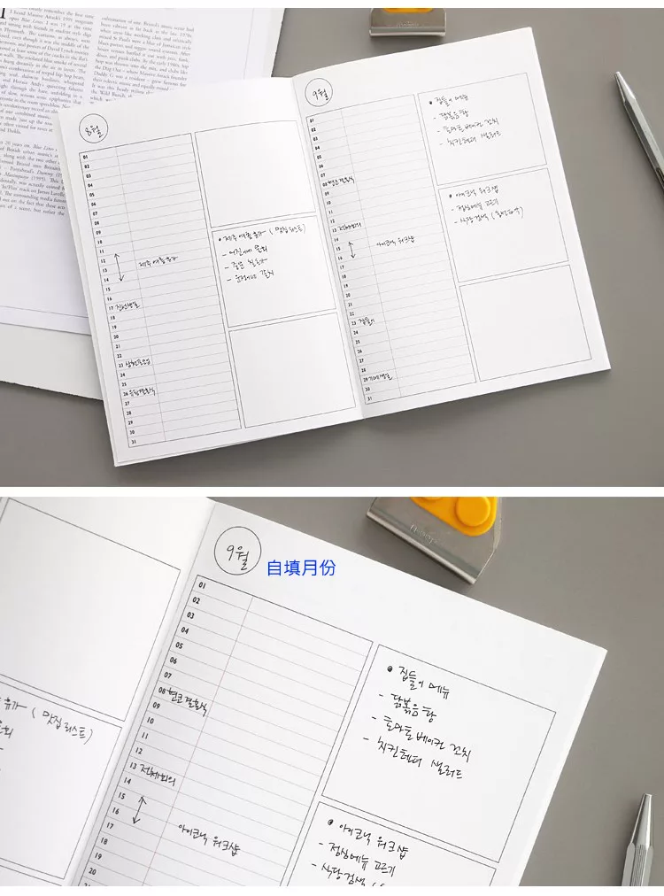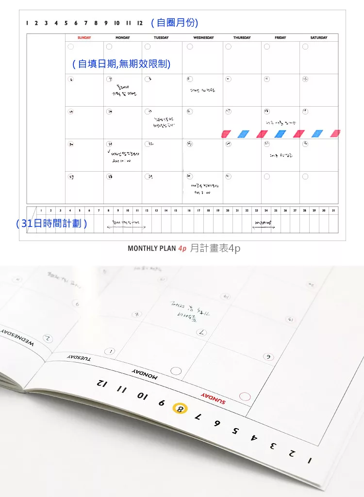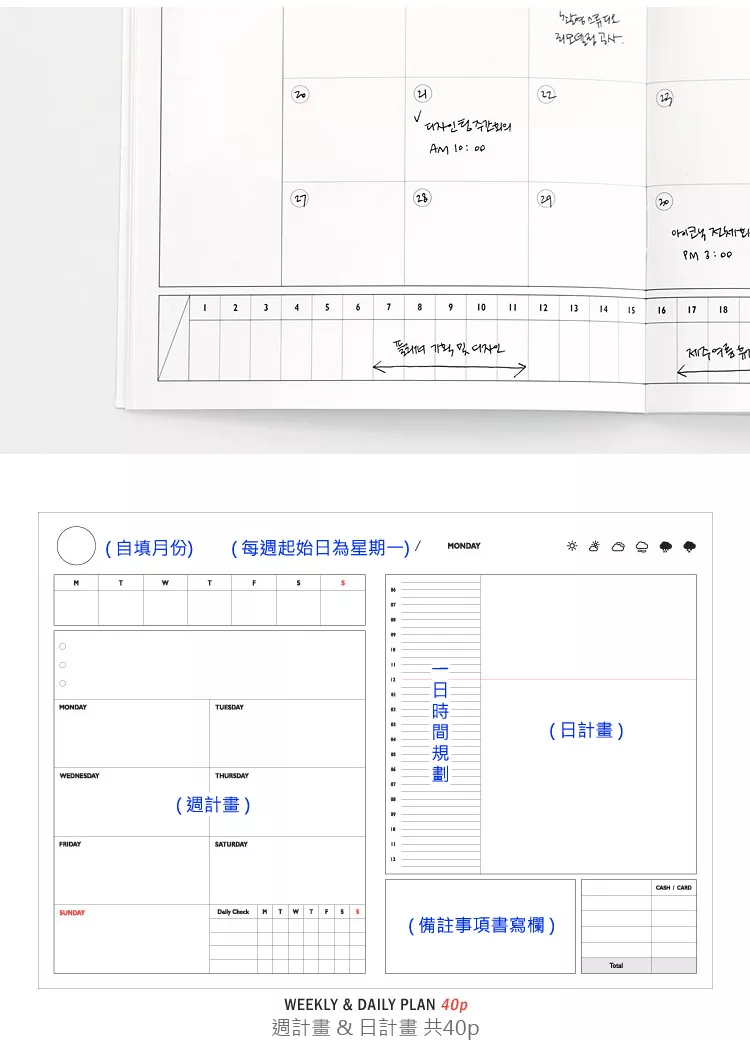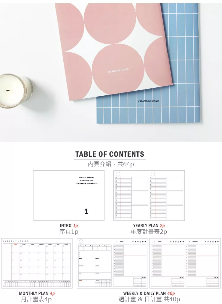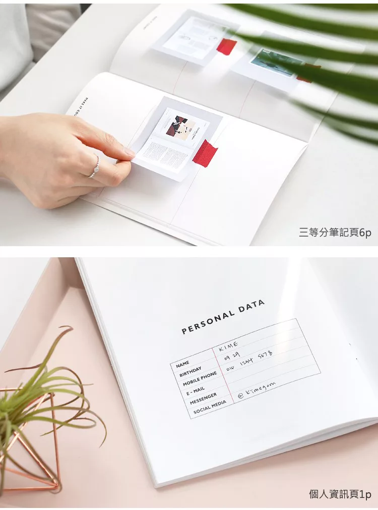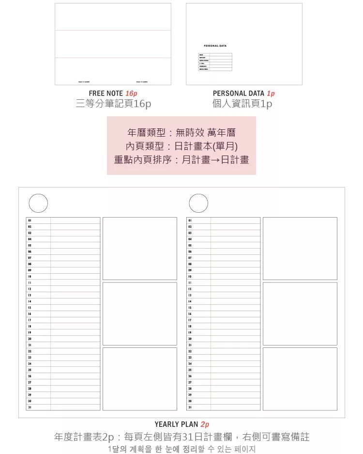 序頁1p→年度計畫表2p→月計畫表4p→週計畫&日計畫共40p→三等分筆記頁16p→個人資訊頁1p。