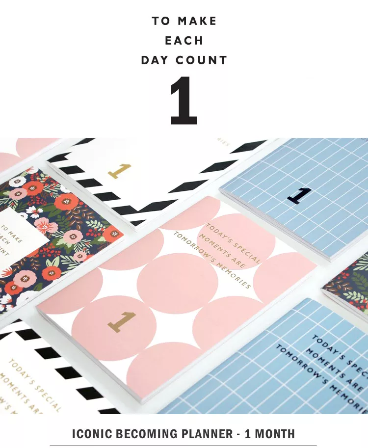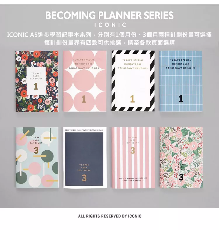 ICONIC 進步學習記事本,1個月份量內計畫頁,部份款式封面燙金字體質感雅緻,封面多元設計插圖,